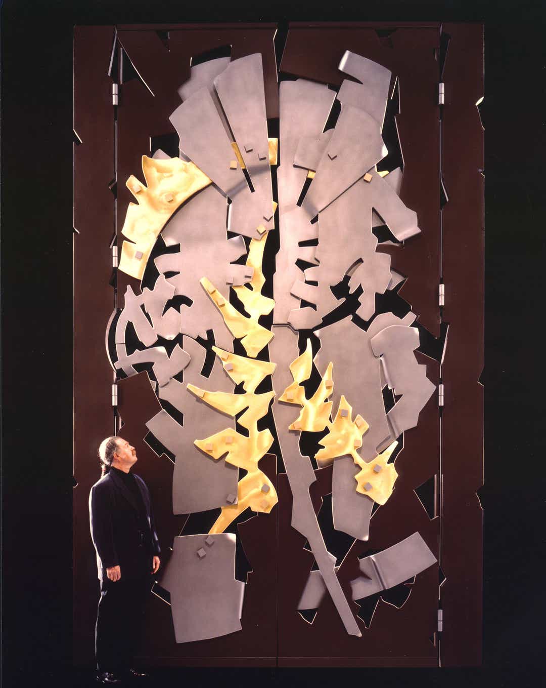 "When she came to me, the thought process was how can I create something that is iconic? So scale was very, very important," he recalled. What emerged was a 20- by nearly 11-foot, four-partition work of formed and fabricated steel, stainless steel and bronze.
