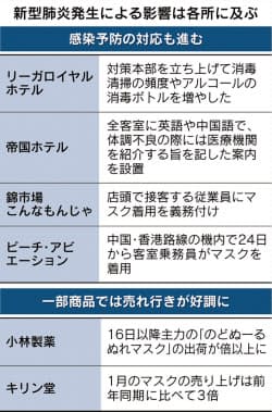 南海電気鉄道の難波駅近くのホテルでも26日から27日にかけて約15件の予約がキャンセルされた。感染を恐れた欧米からの宿泊客のキャンセルも含む。担当者は「観光業にとっては大きな痛手。早く落ち着くことを祈るしかない」と話した。