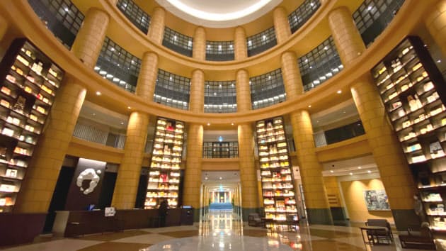 吹き抜けの円形ロビーには高さ約8メートルの書架を6本設け、編集工学研究所(東京・世田谷)が選定した世界…