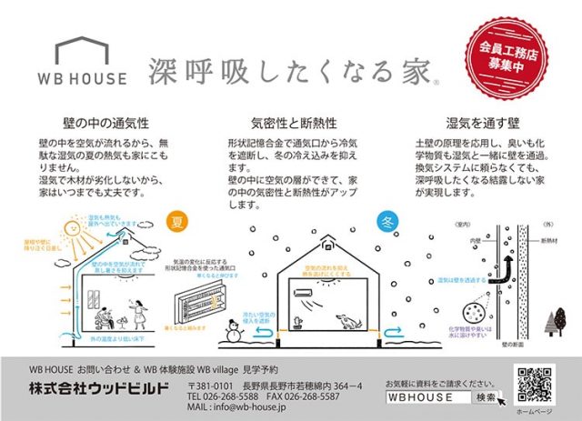 ウッドビルド(長野市)は、「通気断熱WB工法」を用いて“深呼吸したくなる家”を実現する「WB HOUSE」を展開する。現在、同工法を取り入れた家づくりを共に行う会員工務店を募集している。WB体験施設WB villageの見学予約も受け付けている。