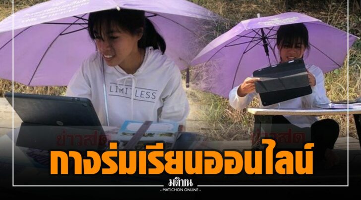 น้องวิว เล่าว่า เมื่อรู้ว่าต้องเรียนออนไลน์ ก็พยายามเดินหาว่าตรงไหนพอจะมีสัญญาณอินเตอร์เน็ตมากพอที่จะเรียนออนไลน์ได้ จนพบว่าที่เชิงเขาหลังบ้าน พอจะมีสัญญาณอินเตอร์เน็ตอยู่บ้าง แม้ว่าจะไม่เสถียร หลุดบ้าง ดีบ้าง แต่ถือว่าเป็นจุดที่ดีที่สุด ที่พอเรียนได้ จากนั้นพ่อจะยกโต๊ะไม้ตัวใหญ่ไปให้ แล้ววางโต๊ะญี่ปุ่นเพื่อวางหนังสือและไอแพดให้เรียนออนไลน์ได้สะดวก แต่ตรงนั้นไม่มีร่มไม้เลย ทำให้เวลาเรียนออนไลน์จำเป็นต้องกางร่มเรียนไปด้วย เพื่อให้เห็นหน้าจอไอแพดและให้บรรเทาความร้อนไปได้บ้าง แต่ก็ยังร้อนอยู่ดี พอเรียนจบวิชาหรือถึงเวลาพักเที่ยง จึงจะเดินกลับมากินข้าวที่บ้าน พอถึงคาบเรียนช่วงบ่ายก็จะเตรียมหนังสือและอุปกรณ์ขึ้นไปเรียนใหม่
