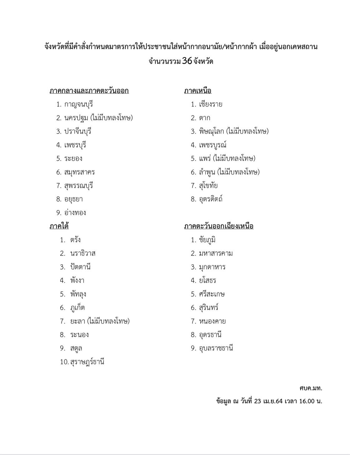 เมื่อเวลา 16.00 น. วันที่ 23 เม.ย.64 ผู้สื่อข่าวรายงานว่า ศูนย์บริหารสถานการณ์แพร่ระบาดของโรคติดเชื้อไวรัสโคโรนา 2019 กระทรวงมหาดไทย (ศบค.มท.) เผยถึงจังหวัดที่มีคำสั่งกำหนดมาตรการให้ประชาชนใส่หน้ากากอนามัยหรือหน้ากากผ้า เมื่ออยู่นอกเคหสถานรวม 36 จังหวัดทั่วประเทศ ประกอบด้วย