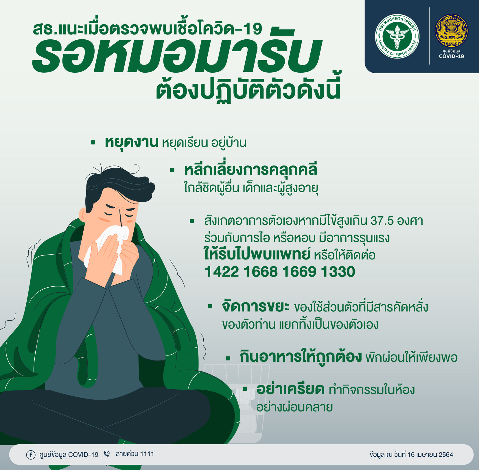 - สังเกตอาการตัวเอง หากมีไข้สูงเกิน 37.5 องศา ร่วมกับการไอหรือหอบ มีอาการรุนแรง ให้รีบไปพบแพทย์หรือให้ติดต่อ 1422 1668 1669 1330