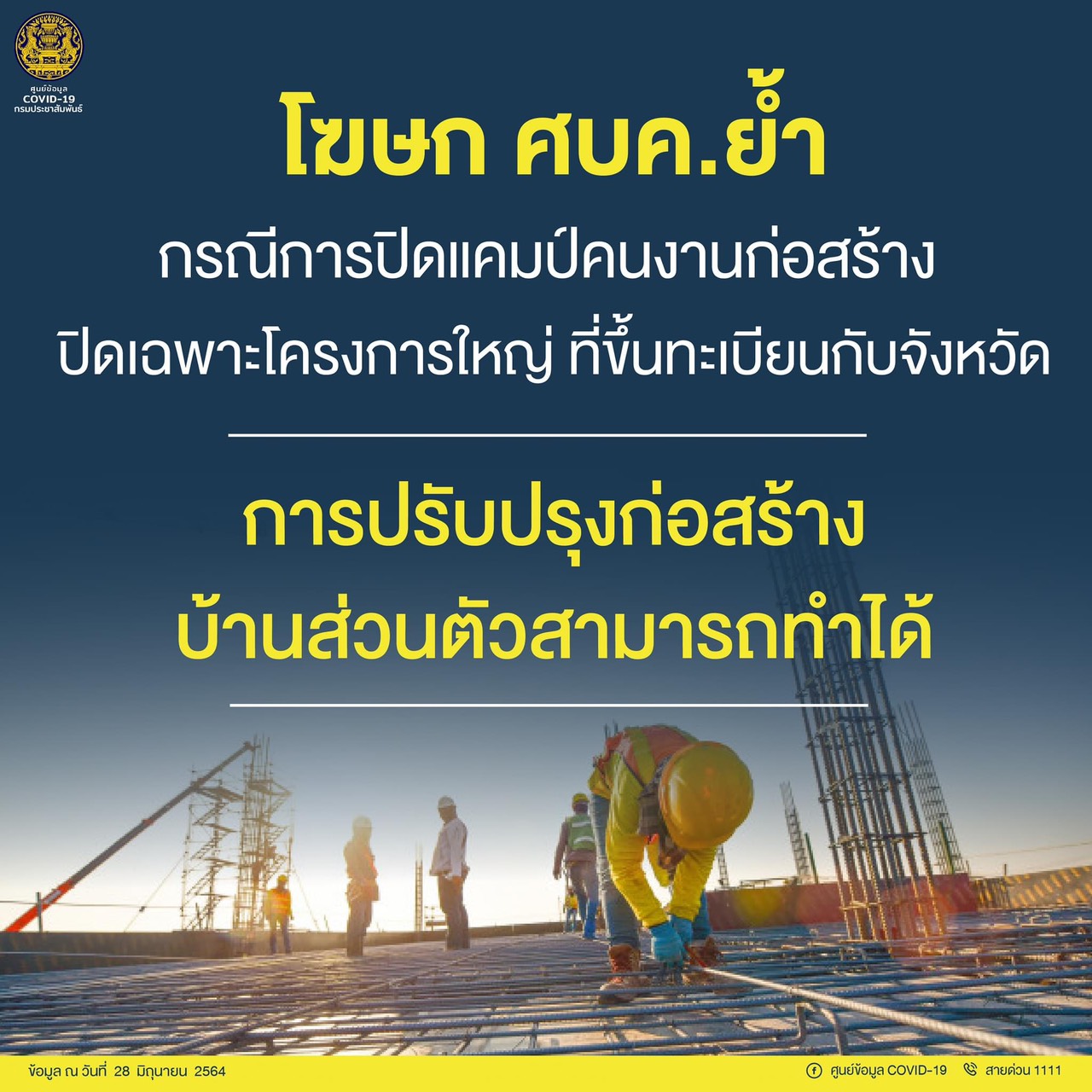 วันที่ 28 มิถุนายน 2564 ผู้สื่อข่าวรายงาน จากกรณี ศบค. ประกาศข้อกำหนดฉบับที่ 25 ให้ปิดแคมป์ก่อสร้างในกรุงเทพมหานคร งดการก่อสร้าง และเคลื่อนย้ายคนงานเพื่อคุมเข้มการแพร่ระบาดเชื้อไวรัสโควิด นั้น มีหลายข้อสงสัยว่า เป็นการปิดเฉพาะแคมป์ก่อสร้างโครงการใหญ่ หรือรวมไปถึงการซ่อม ก่อสร้าง ตกแต่งบ้านส่วนตัว หรือไม่ และสามารถทำได้หรือเปล่า?