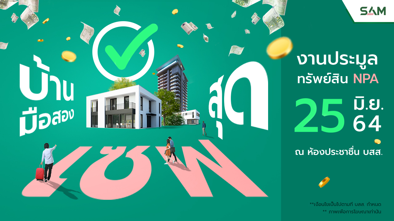 วันที่ 14 มิถุนายน 2564 นายธรัฐพร เตชะกิจขจร ผู้จัดการ บริษัท บริหารสินทรัพย์สุขุมวิท จำกัด (บสส.) หรือ SAM เผยว่า SAM พร้อมจัดงานประมูลทรัพย์สินรอการขาย (NPA) ผ่านช่องทางอออนไลน์อย่างต่อเนื่องในเดือนมิถุนายน 2564 เตรียมคัดอสังหาริมทรัพย์มือสองทั่วไทย เปิดโอกาสการลงทุนแก่นักลงทุนรายย่อยและรายใหญ่ออกประมูล มูลค่ารวมทั้งสิ้นประมาณ 500 ล้านบาท โดยกำหนดจัดงานใน วันศุกร์ที่ 25 มิถุนายน 2564 ณ สำนักงานใหญ่ของ SAM อาคารซันทาวเวอร์ส บี ชั้น 24 ถ.วิภาวดีรังสิต