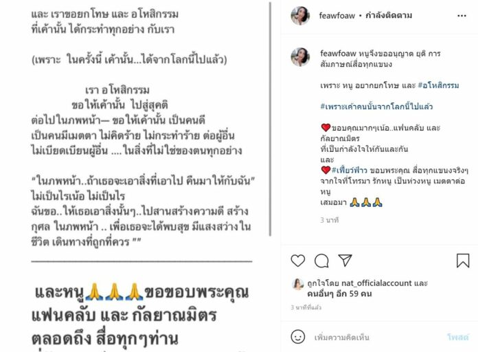 ฉันขอให้เธอเอาสิ่งนั้นๆ ไปสานสร้างความดี สร้างกุศลในภพหน้า เพื่อเธอจะได้พบสุข มีแสงสว่างในชีวิตเดินทางที่ถูกที่ควร และหนูขอขอบพระคุณแฟนคลับ และกัลยาณมิตร ตลอดถึง สื่อทุกๆ ท่าน”