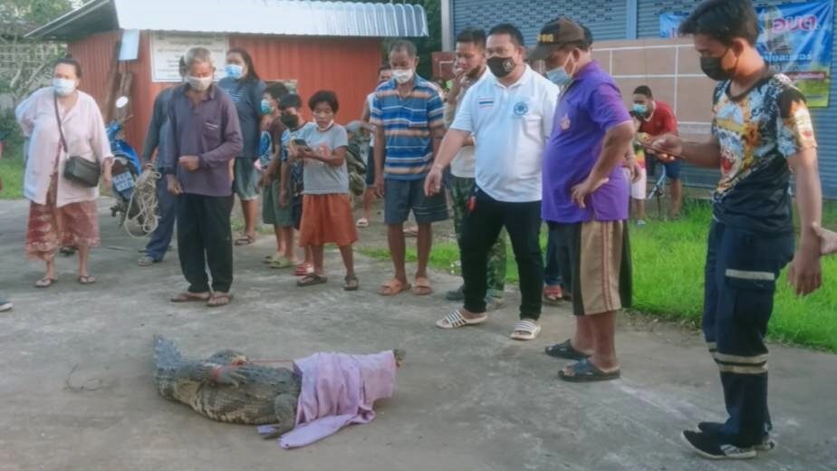 หลังรับแจ้งได้ส่งอาสาสมัครจึงเดินทางไปยังหมู่บ้านดังกล่าว พบจระเข้ยาว 2เมตร น้ำหนัประมาณ 40กก. นอนอยู่ข้างบ้านประชาชนมีชาวบ้านออกมายืนมุงดูด้วยความสนใจ จึงใช้เชือกมัดจระเข้ตัวดังกล่าวไว้เพื่อความปลอดภัย