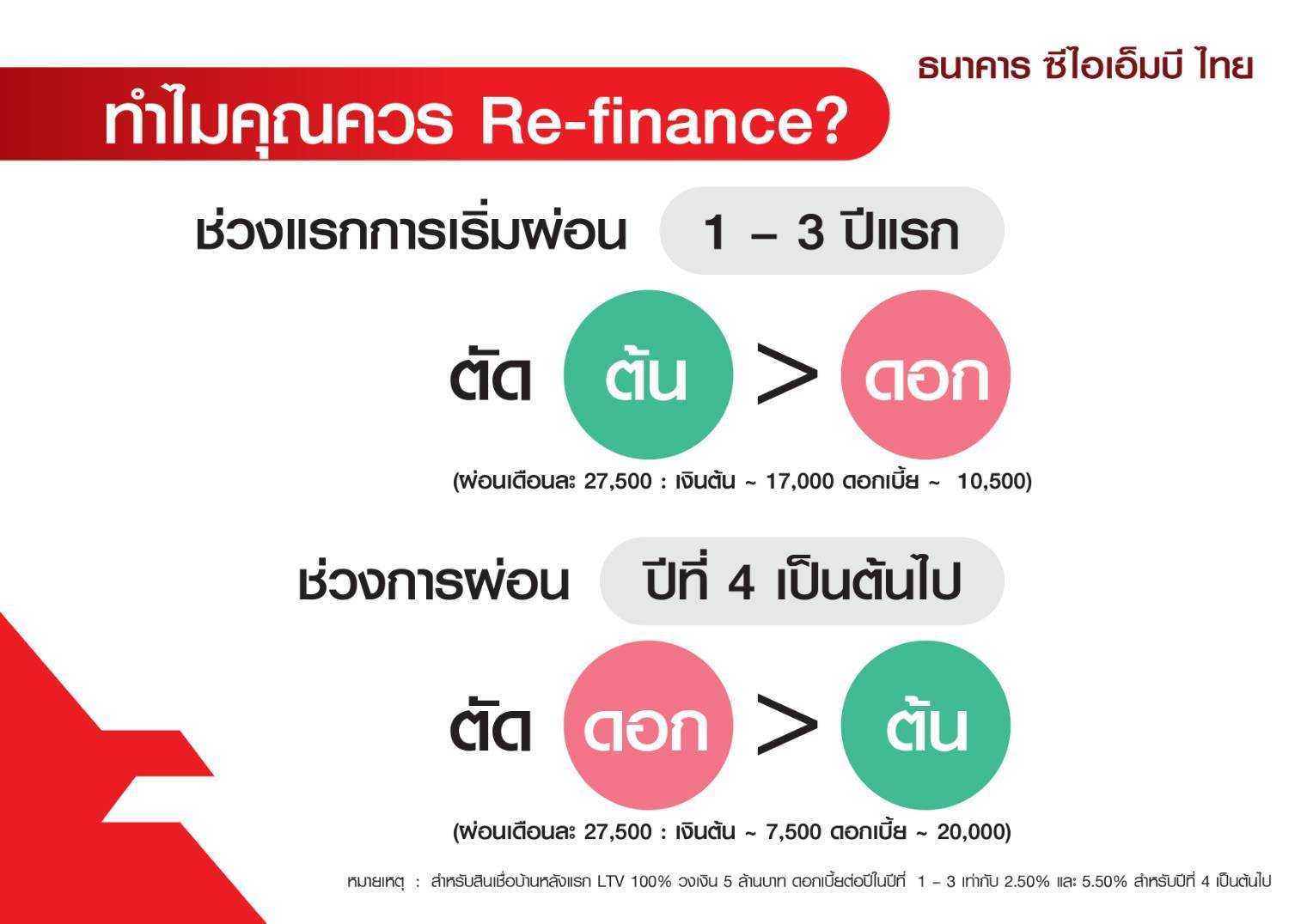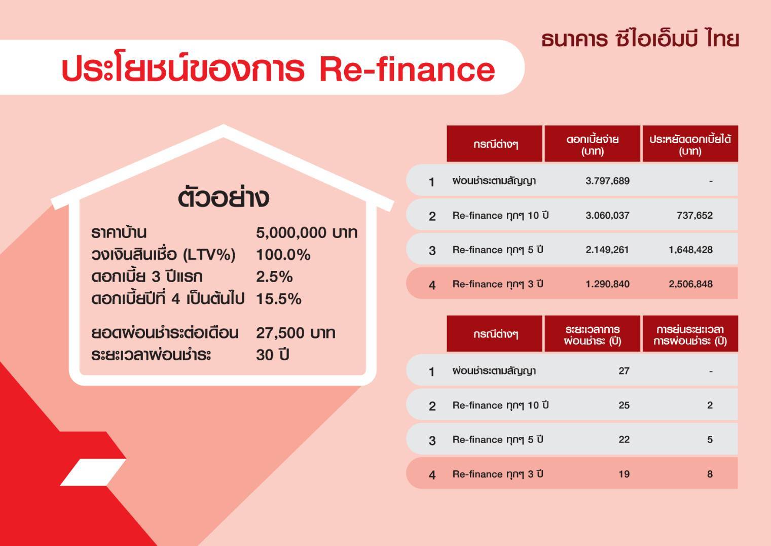 “ในช่วงโควิดที่เศรษฐกิจยังไม่กลับมาฟื้นตัวเต็มที่ ธนาคารจึงอยากกระตุ้นลูกค้าสินเชื่อบ้านให้ลุกขึ้นมาบริหารหนี้อย่างมีประสิทธิภาพ ลดภาระทางการเงิน ด้วยการรีไฟแนนซ์บ้าน เนื่องจากหากดูภาระการจ่ายค่างวดในช่วงปีที่ 1-3 จะเห็นค่างวดไปตัดเงินต้นค่อนข้างมาก แต่หลังปีที่ 4 เงินค่างวดจะถูกไปตัดดอกเบี้ยถึง 70% หากลูกค้าหันมารีไฟแนนซ์จะช่วยลดภาระดอกเบี้ยได้ถึง 50% และจำนวนระยะเวลาการผ่อนชำระจะลดลงจาก 30 ปีด้วย”
