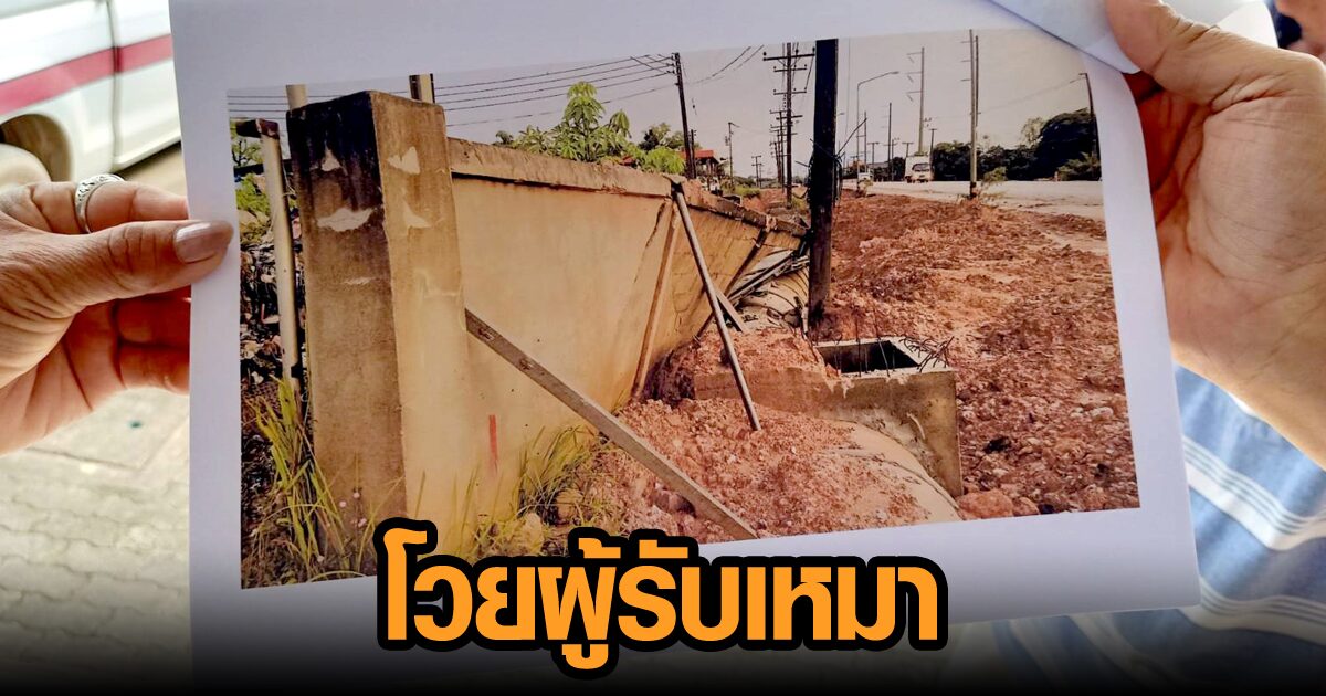 ชาวบ้านรวมตัวบนโรงพัก โวยผู้รับเหมาถนนทางหลวงทำหมุดโฉนดหายกำแพงบ้านพังยับ ด้านนายช่างคุมงานแจงจะรีบดำเนินการแก้ไขให้ด่วน